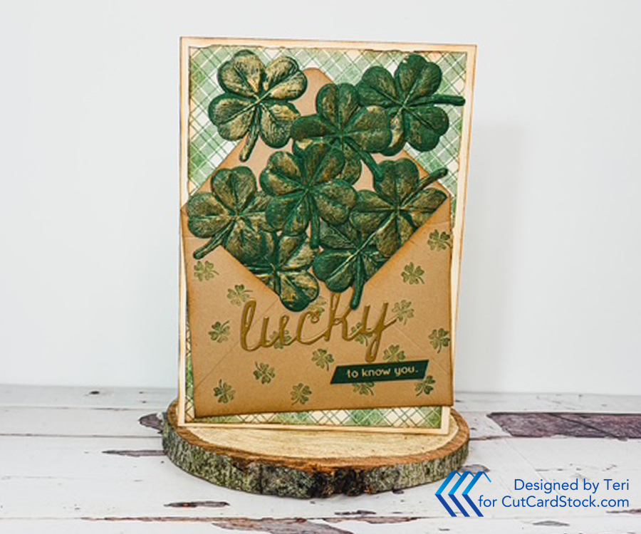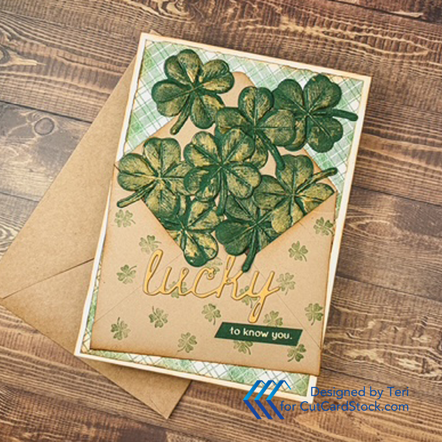 I love shamrocks! How about you? Our older son can walk in a field of grass and find four leaf clovers! I have never found one! Today I am sharing a colorful St. Patrick's Day card full of embossed shamrocks. Hi, it is Teri with TerisMailbox posting for CutCardStock.