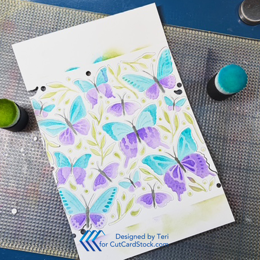 Use bright colors of ink to fill in the open areas on the stencil with a blending tool. Use the stencil set in order to add layers of color. Once completed, pop the butterflies and leaves out.