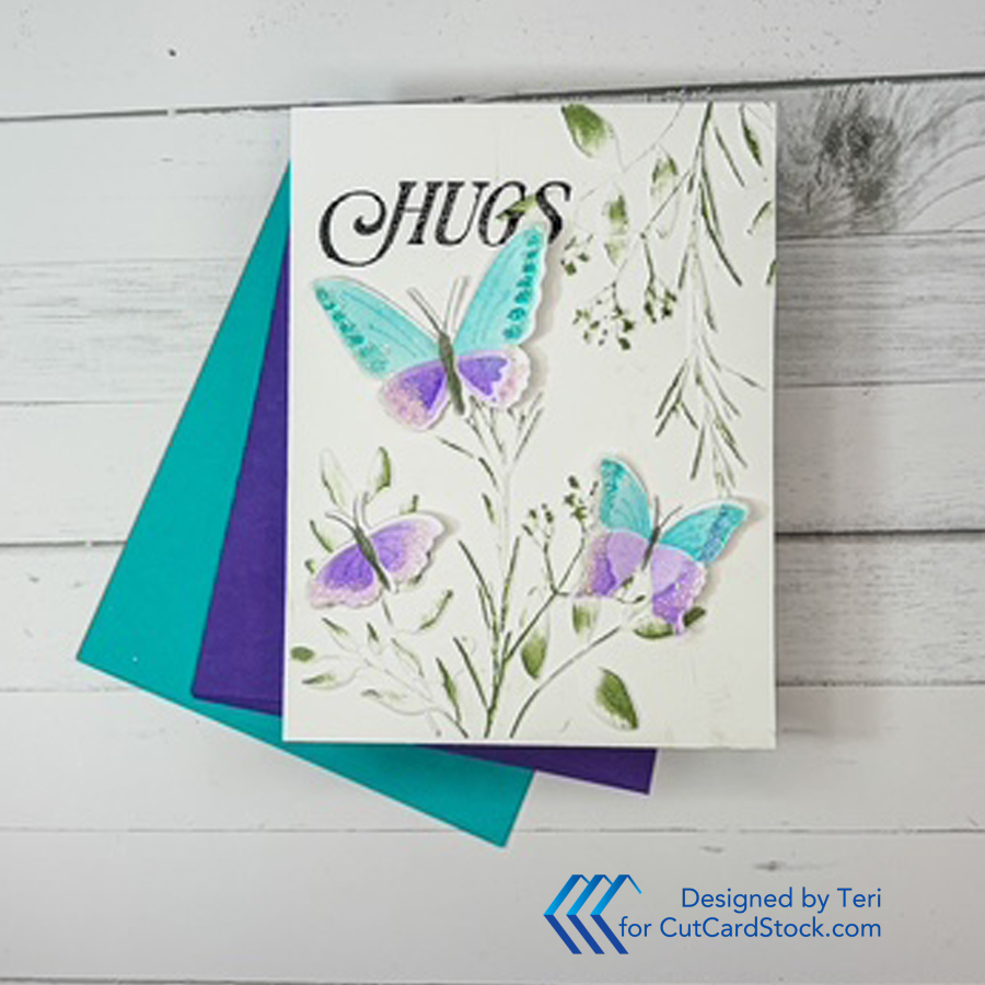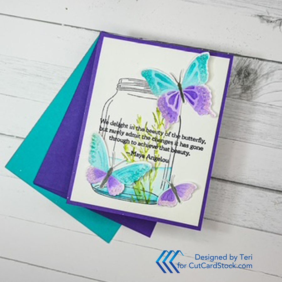 For the second card, trim a piece of Grape Jelly Cardstock to 4.25 x 5.5 inches and attach to the A2 card base. Trim the watercolored panel to 4.0 x 5.25 inches and center on the purple panel. Select a few butterflies and glue randomly to the base.