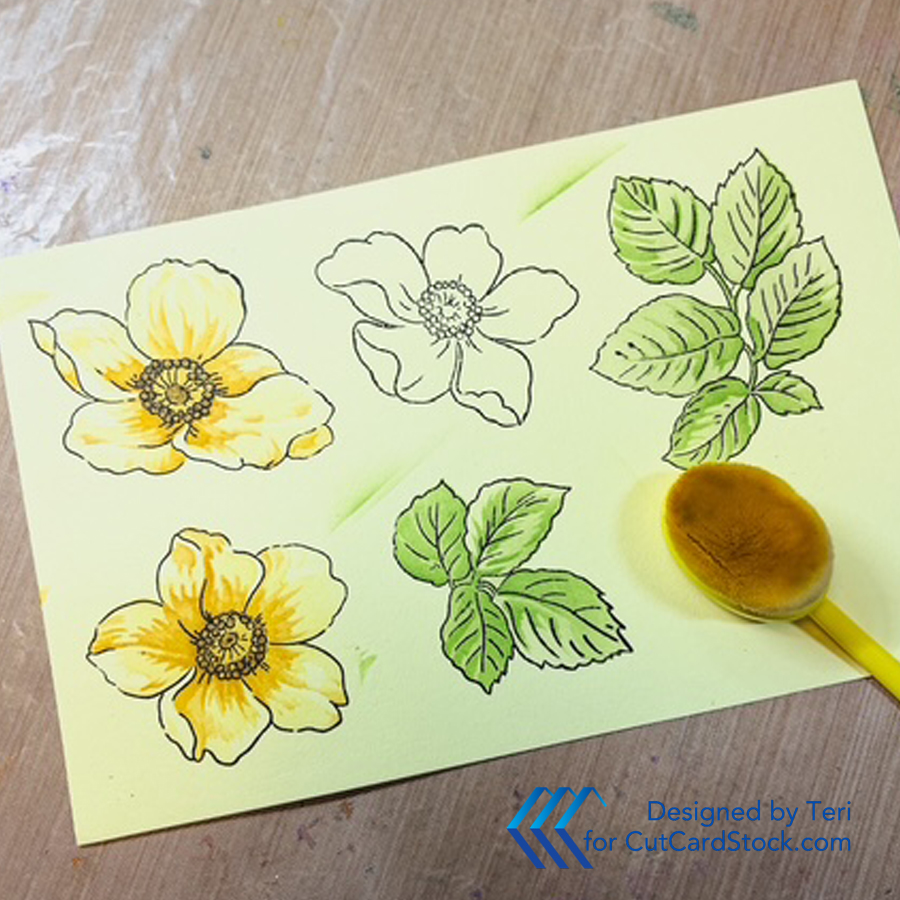 The card needed a pop of color or texture in the background. I went for color! Use an A2 sized piece of 80 lb. White Cougar Cardstock. Choose two of the colors you used for the flowers and leaves. Rub the ink pad directly onto the cardstock being sure to get consistent colors. The direct to paper technique allows more saturation when compared to ink blending with a tool.